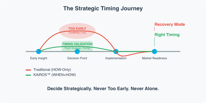 Unlike other frameworks that rely on subjective judgment, the KAiROS™ system provides data-driven validation of strategic timing and implementation readiness, transforming intuition into evidence-based confidence through three strategic checkpoints: